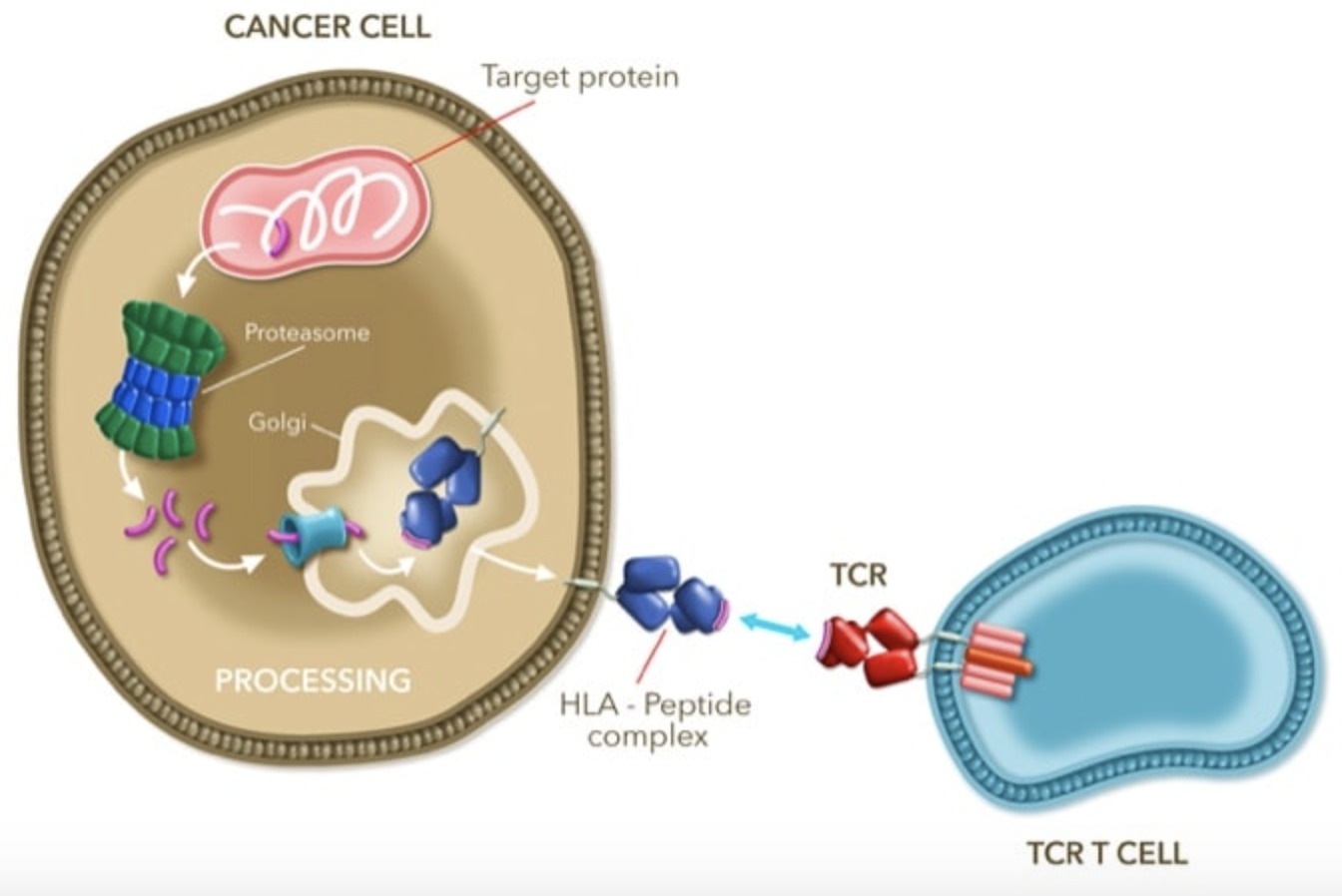 The immune system plays an important role in targeting and destroying cancer. Antibodies target whole proteins on the cell surface and T-cell receptors (TCR) target peptides presented on the Human Leukocyte Antigen (HLA) complex. TCRs target and bind to a specific HLA peptide complex, resulting in the destruction of the relevant cell. Binding of naturally occurring T-cell receptors to cancers is not very effective because cancer proteins appear very similar to naturally occurring proteins and are very good at evading the immune system.